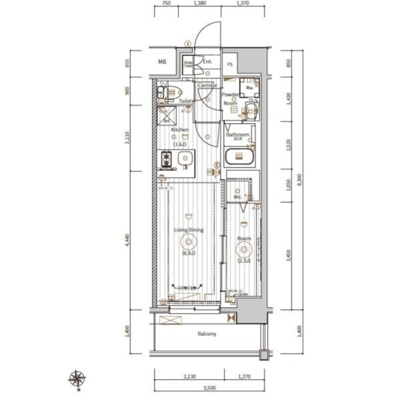 | 間取り詳細 | 洋室 2.3畳 、 LD 6.9畳 、 K 畳 |
