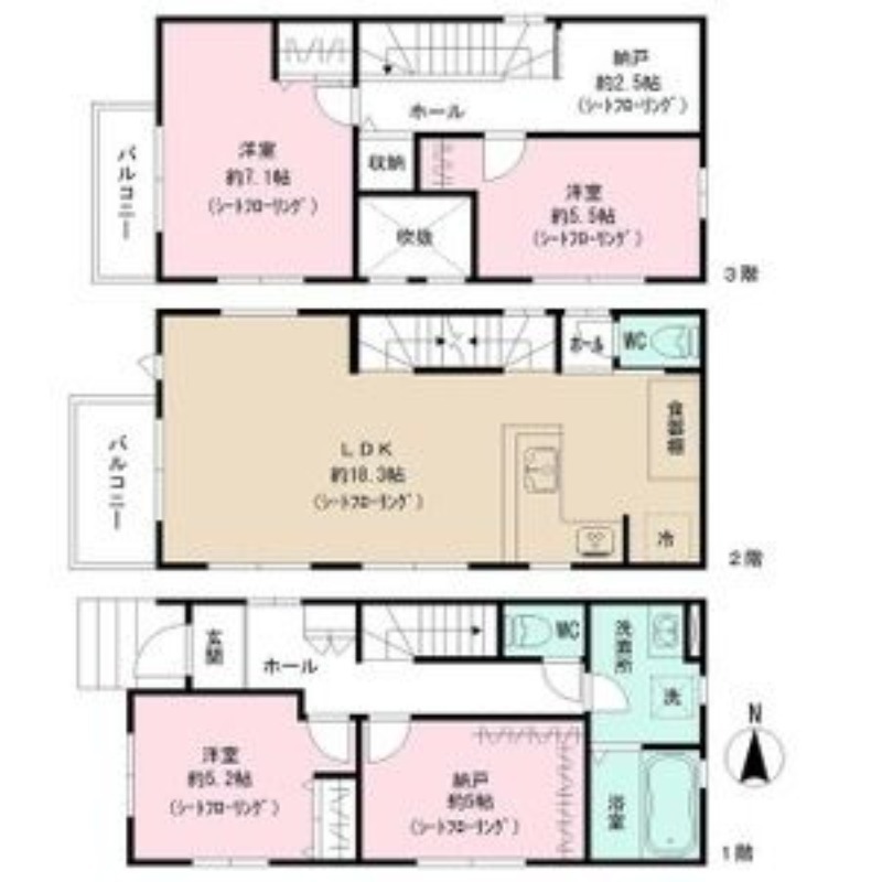 | 間取り詳細 | LDK 18.3畳 、 洋室 7.1畳 、 洋室 5.5畳 、 洋室 5.2畳 、 その他 5畳 |