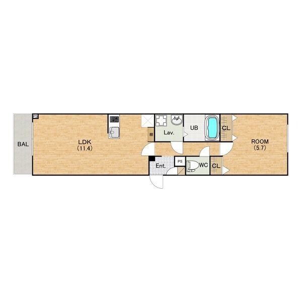 | 間取り詳細 | LDK 11.4畳 、 洋室 5.7畳 |