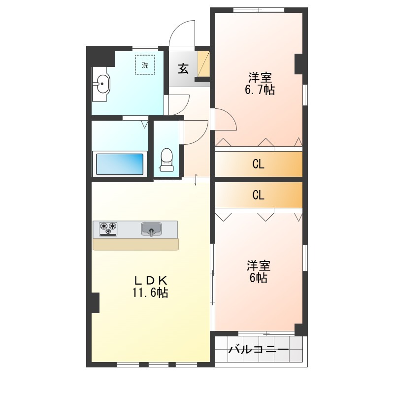 | 間取り詳細 | LDK 11.6畳 、 洋室 6.7畳 、 洋室 6畳 |
