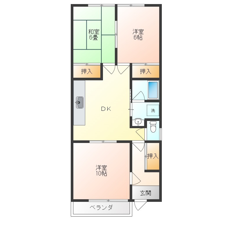 | 間取り詳細 | 洋室 6畳 、 洋室 10畳 、 和室 6畳 、 DK 畳 |