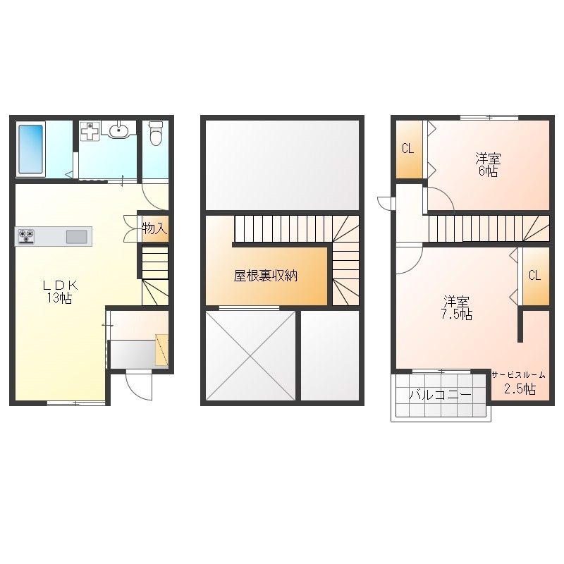 | 間取り詳細 | LDK 13.3畳 、 洋室 7.5畳 、 洋室 6畳 |