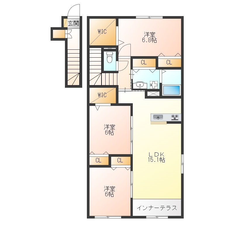 洋室 6畳 洋室 6.8畳 LDK 15.1畳 |