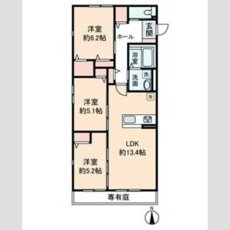 | 間取り詳細 | 洋室 5.1畳 、 洋室 5.2畳 、 洋室 6.2畳 、 LDK 13.4畳 |